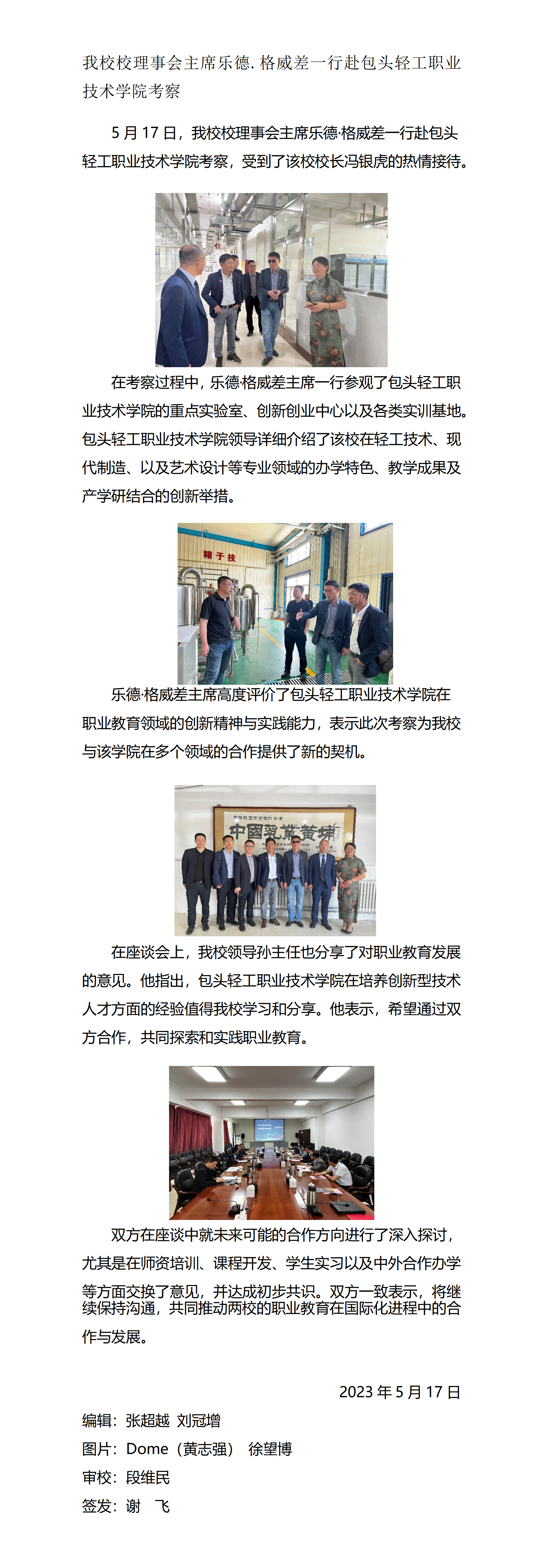 > 2023年5月17日我校校理事会主席乐德.格威差一行赴包头轻工职业技术学院考察。